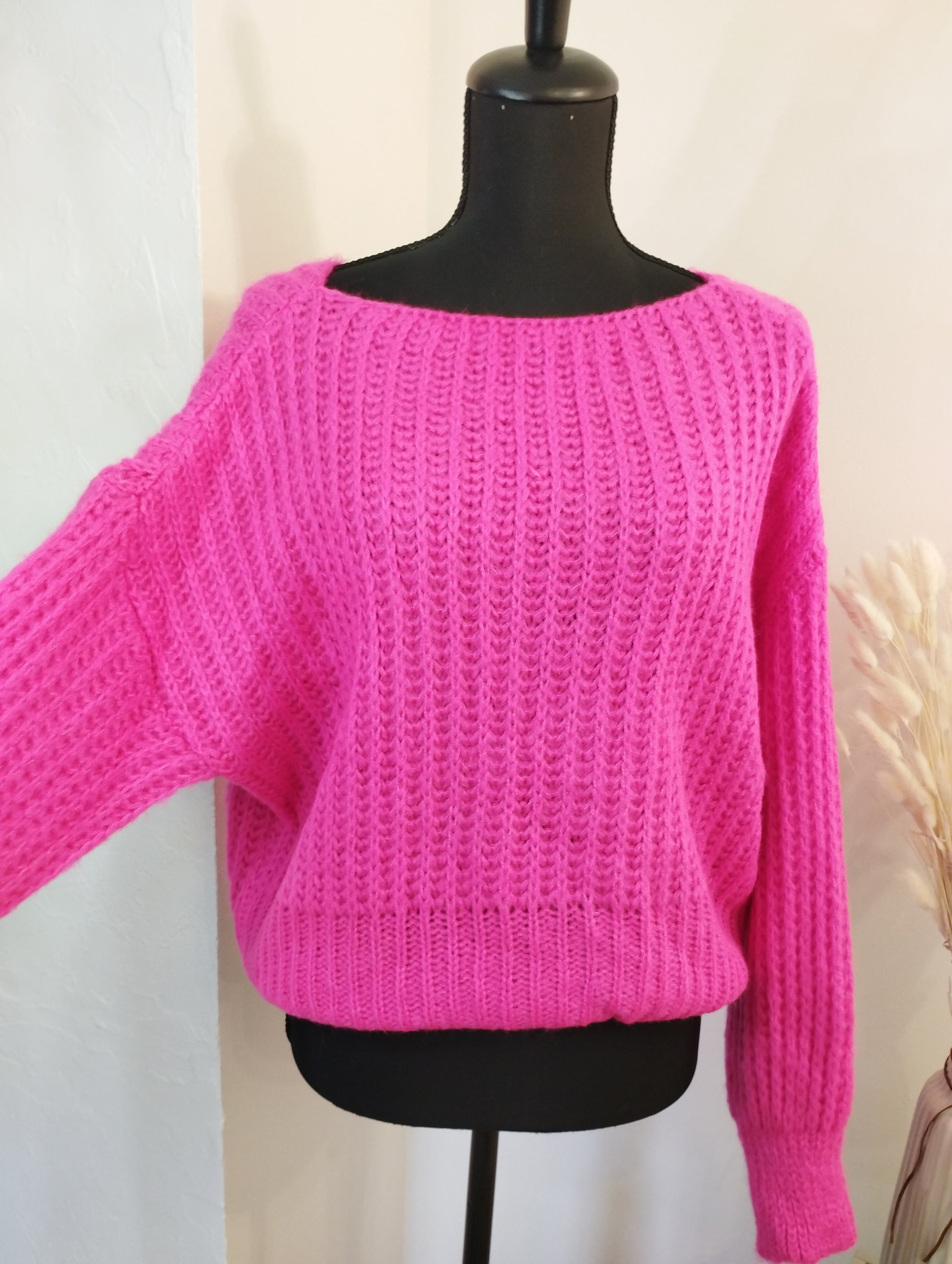 - Ce pull rose est un modèle en maille épaisse, offrant à la fois confort et chaleur.