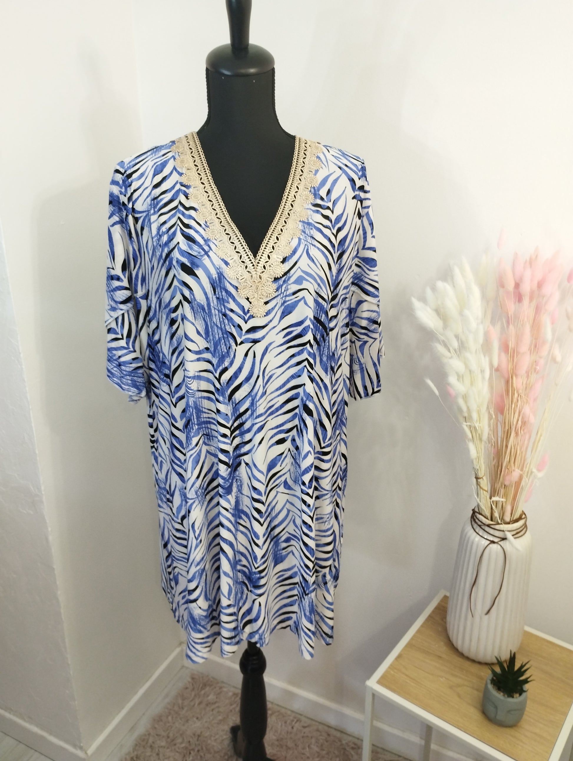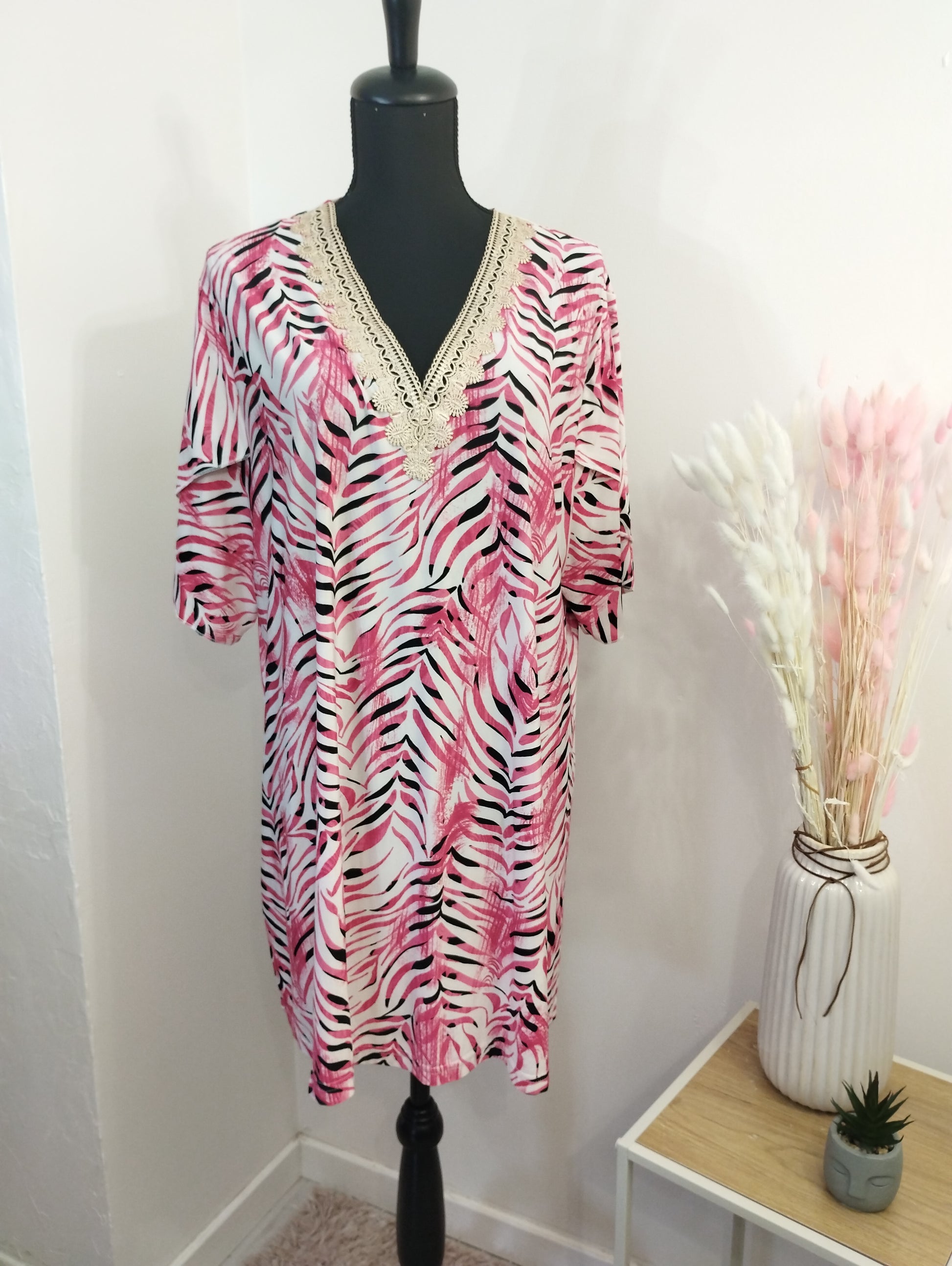 Ajoutez une touche exotique et féminine à votre garde robe avec la tunique Zalina. Son imprimé zébré coloré , ses tons vibrants et son col orné de broderie dorée font d'elle une piéce aussi confortable qu'élégante.